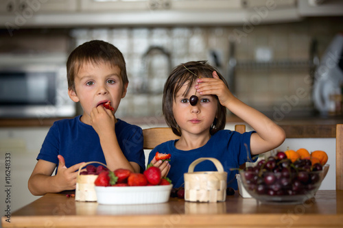 children, fruit, food, dish, meal, table, many, raspberry, strawberry, blueberry, apricot, berry, kitchen, toddler, white, bowl, sweet, boy, sitting, diet, snack, horizontal, breakfast, summer, morning, 2, brother, sibling, love, eye, cute, smile, funny, eat, cherry, lifestyle, healthy, sharpened, holding, colours, enjoying, childhood, home, beautiful, children, nourishment, health, alone, nourishment, happy