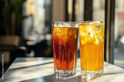 Two tall glasses filled with refreshing drinks, one vibrant yellow and the other rich amber iced tea