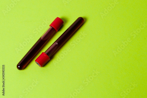 Two test tubes with blood isolate on green background. Concept medicine, the fight against viruses and bacteria, diseases