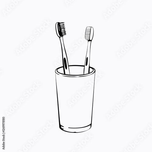 Two toothbrushes stand in glass, sketched in minimalist line art. Simple bathroom scene with copy space. Concept: dental care, bathroom decor, line illustration