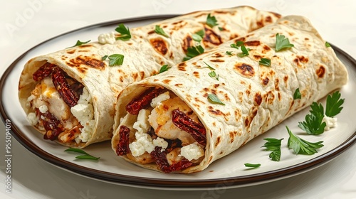 Two tortillas are artfully rolled, showcasing their savory filling with vibrant colors