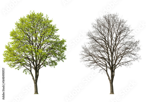 Two trees side by side, one in full green foliage representing summer and the other bare with branches representing winter, isolated on transparent background