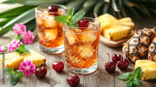 cocktail, drink, glasses, beverage, ice, pineapple, cherry, mint, tropical, fresh, summer, refreshment, sweet, fruit, delicious, tasty, wooden, table, garnish, flower, floral, holiday, vacation, cool, cold, fruity, party, celebration, juice, alcohol, exotic, vibrant, sunny, bright, still, life, arrangement, closeup, macro, detail, surface, freshness, chilled, prepared, serve