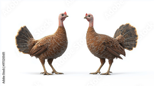Two turkeys standing next to each other on a white background. The turkeys are brown and have feathers on their tails