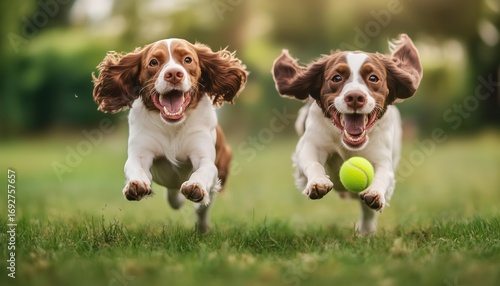 dog, spaniel, springer, english, running, puppy, park, white, dog, playing, grass, tennis, ball, 2, puppy, canino, pet, animal, sport, fun, game, fetch, energy, happy, active, athletic, excited, frisbee, field, outside, summer, spring, autumn, winter, leap, jump, bound, chase, retrieve, bark, tail, wag, ear, fur, coat, breed, mammal, companion