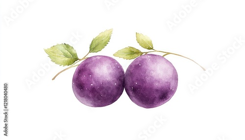 Two vibrant purple plums with green leaves on a white background, ideal for fresh food designs