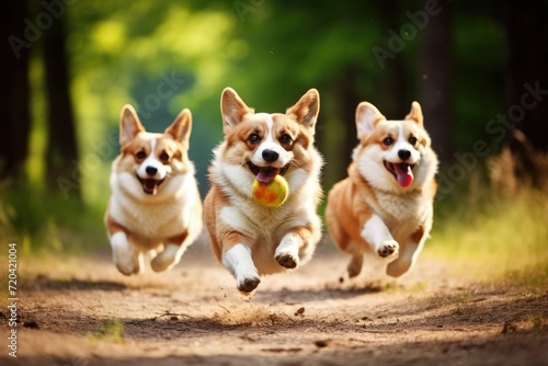 Two Welsh corgi dogs running with a ball, Energetic dogs running after a ball on a sunny day, AI generated