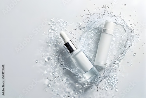 Two white cosmetic bottles surrounded by splashing water on a white background studio shot