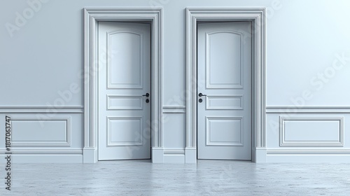 Two white doors in a light-gray room; interior design; choice; possible use for real estate