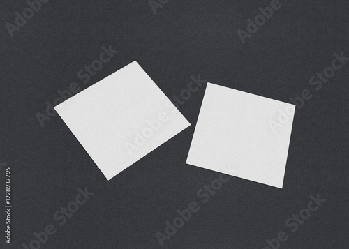 Two white squares placed on a dark background showcase a minimalist geometric design, Blank white Business card mockup stacks at grey textured paper background