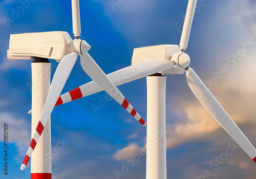 Two wind generators. Windmills against sky. Extraction of electricity from natural sources. Generation of electricity from wind. Wind turbines for taking care of environment. Selective focus