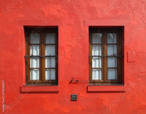 Two Windows with Grilles on a Red Wall: Architectural Detail and Texture