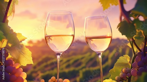 Two wine glasses filled with white wine at sunset in a vineyard with grapes and leaves