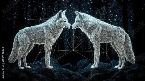 Two wolves standing side by side, their eyes locked in a moment of quiet companionship, set against a backdrop of a starry night sky.
