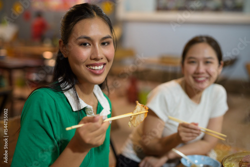 woman, smiling, eating, food, thai, 20s, asian, asian cuisine, bar-b-q, candid, chopstick, couple, delicious, friends, friends, grill, grilling, happy, lesbian, love, night, people, pork meat, real people, human relationships, eatery, sitting, smile, thai food, together, young, table, person, happiness, lifestyle, party, fun, 2, girl, student
