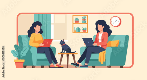 woman, cat, living, room, sofa, laptop, work, home, online, technology, comfort, pet, relaxation, indoor, casual attire, sitting, modern, digital, lifestyle, connection, learning, communication, freelance, studying, remote, screen, sharpened, entertainment, domestic, cute, companion, cosy, illustration, flat, design, art, graphic, creative, person, female, people, family, friendship, partnership, teamwork, social, leisure, hobby