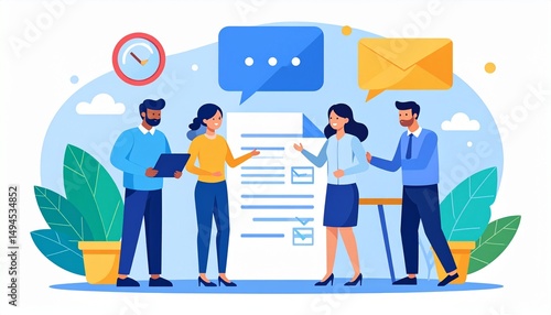 Two women and two men team meeting of four employees. Next to the characters