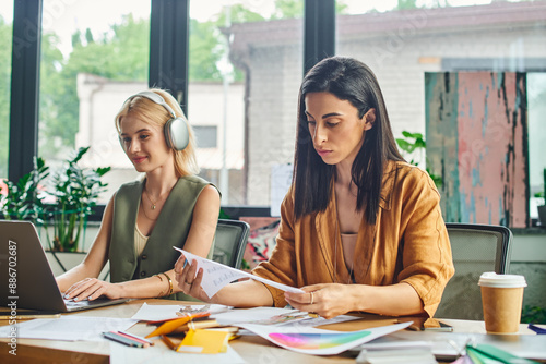 interracial, woman, businesswoman, agency, office, business, attire, caucasian, middle eastern, diversity, lesbian, couple, female, modern, project, work, collaborate, creative, sharpened, professional, confident, workspace, cosy, laptop, earphones, paperwork, design, colours, palette, meeting, discussion, career, team, teamwork, success, progress, innovation, bliss, key