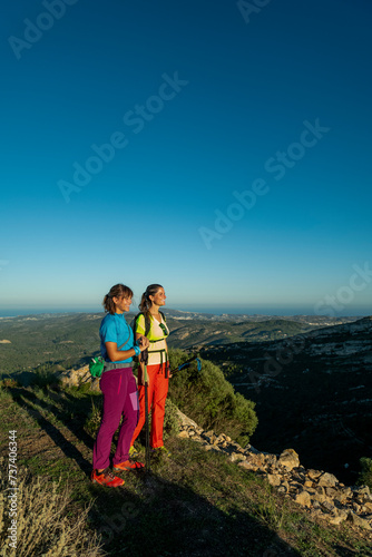 Two women hikers enjoying the beautiful nature from high above, Lliber, Alicante, Costa Blanca, Spain - stock photo