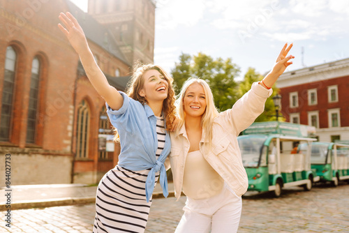 Two women in good mood posing outdoors. Sunny day. Concept of lifestyle, fashion, travel.