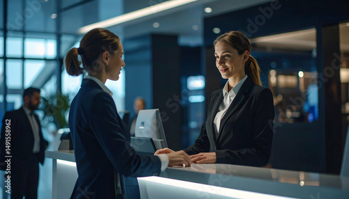 hotel, reception, desk, business, service, conversation, professional, formal, interaction, client, client, employee, suit, jacket, white shirt, smiling, happy, communication, assistance, lobby, interior, modern, contemporary, elegant, clean, light, dark, blurred, background, people, woman, corporate, greeting, welcome, hospitality, travel, accommodation, check-in, checkout, staff