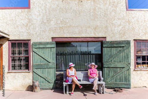 adult, bench, carefree, caucasian, day, fashion, female, free time, horizontal, outdoors, people, relax, relaxation, relaxing, sitting, stucco, summer, sunshine, together, 2, two people, white, window, woman
