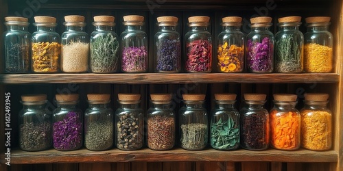 jar, dried flowers, spice, seed, organised, variety, colourful, yellow, purple, green, brown, orange, natural light, warm tones, botanical, home decor, natural, rustic, organic, herbalism, collection, wood grain, floral, textured, health, wellness