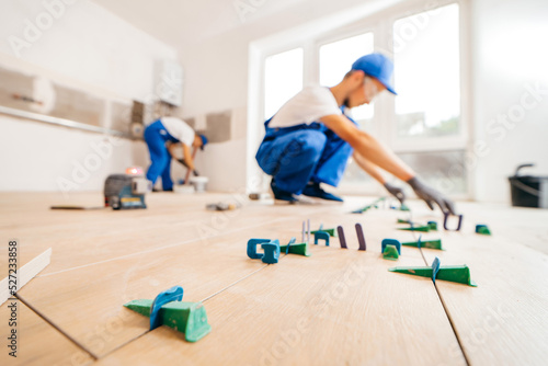 Two workers in a special uniform laying tiles with tile leveling system and laser level on the floor in a new house