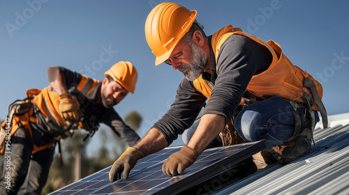 Two workers in safety gear and helmets installing solar panels on a rooftop under clear blue sky. Focus on renewable energy and professional installation.