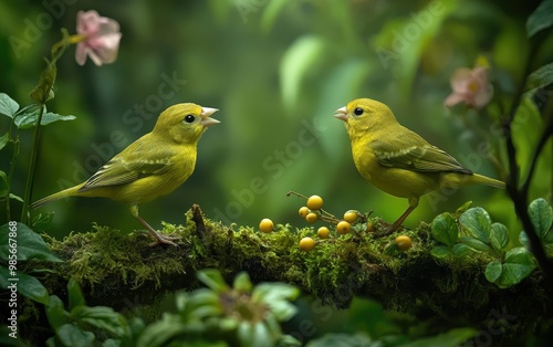 Two yellow finches, perched on moss-covered branches in an enchanted forest settin