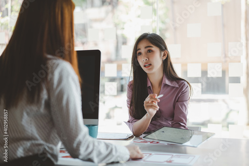 Two young asian women colleagues in smart casual wear planning business strategy together at the modern coworking space.