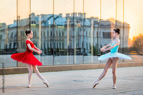 two young ballerinas in a bright red and blue tutu are dancing against backdrop of the reflection of city sunset