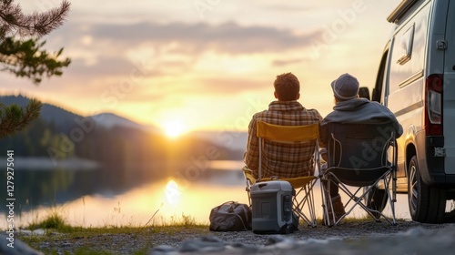 sunset, lake, camper, van, male, caucasian, young, adult, outdoors, nature, camping, chair, adventure, relaxation, travel, scenic, friendship, leisure, vacation, evening, calmness, mountain, sky, water, tree, horizon, journey, get-away, peaceful, freedom, exploration, bonding, wilderness, lifestyle, serene, backpack, thermos, enjoyment, retreat, chill, escape, unwind, dusk, landscape