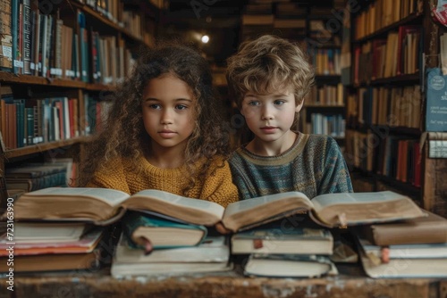 Two young children engrossed in reading books sit at a library table surrounded by shelves filled with publications, their faces filled with wonder and curiosity as they explore the world through lit
