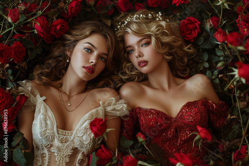 Two young fairy princess with long hair in elegant dress in flowers. Romantic fantasy portrait of medieval queen. Beautiful nymph or elf girl in spring garden. Beauty and passion. Fairy tail concept