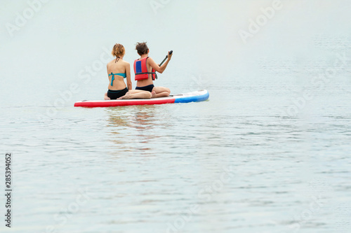 man, water, board, paddle, people, 2, girl, woman, sport, leisure, hobby, lake, sitting, back, swimwear, season, summer, spring, colours, red, blue, vest, rescue, vacation, trip, tour tourism, holiday maker, day, midday