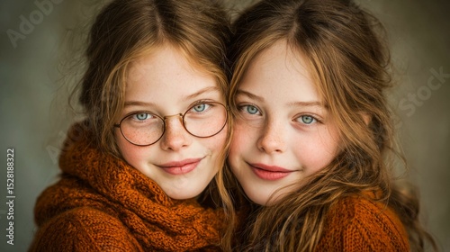 Two young girls wearing glasses and orange sweaters are smiling at the camera. The image conveys a warm and friendly atmosphere, as the girls appear to be enjoying each other's company