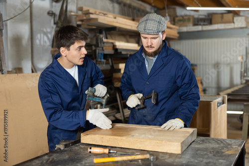 Two young male carpenters fixing wooden board with clamp on workbench in wood workshop