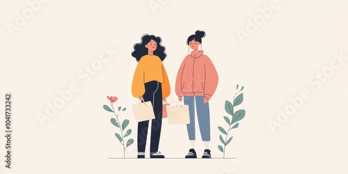 woman, shopping, plant, friends, bag, style, fashion, casual attire, smile, urban, life, outfit, retail, hold, racked, day, portrait, daytime, nature, market, relax, youthful, 2, friendship, trendy, background, lovely, teamwork, purchase