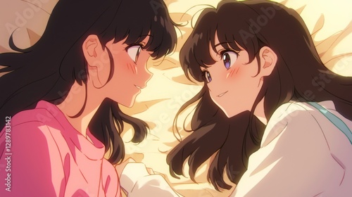 Two Young Women Smiling in Retro Fashion, Pink Sweater and White Shirt, Muted Pastels
