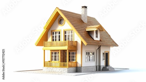 house, home, building, architecture, residential, story, gold, trim, brown, roof, white, chimney, window, window, door, door, balcony, porch, railing, stair, step, stone, brick, foundation, exterior, facades, siding, suppressing, driveway, front, yard, grass, sky, isolated, rendering, three-dimensional, model, design, style, modern, traditional, cosy, comfortable