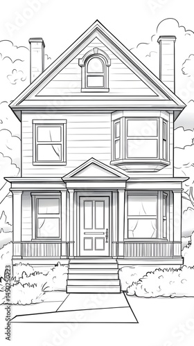 house, home, dwelling, residence, building, architecture, two-story, gable, roof, bay, window, porch, facades, symmetric, classic, traditional, victorian, colonial, elegant, charming, residential, structure, design, plan, drawing, vignetting, illustration, blueprint, line, art, black, white, simple, clean, line, detail, elevation, front, view, entrance, door, stair, landscaping, shrub, bush, plant, step, chimney, window