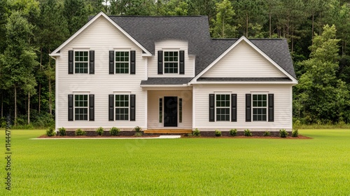 house, home, real estate, property, architecture, building, residential, dwelling, exterior, facades, two-story, white, shutter, black, window, door, lawn, grass, green, tree, wood, forest, landscaping, yard, suburban, rural, countryside, family, dream, american, style, design, new, modern, contemporary, elegant, luxury, roomy, comfortable, cosy, beautiful, nature, landscape, sunlight, day, summer, spring, autumn, front