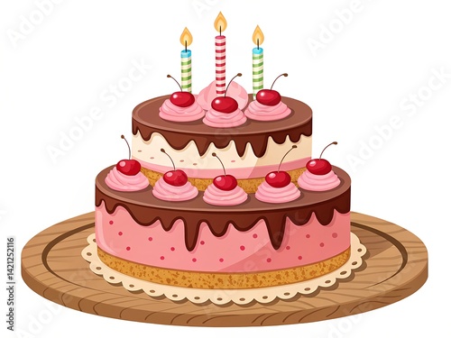 cake, birthday, cherry, candle, sweet, dessert, celebration, party, chocolate, icing, whipped cream, illustration, pink, layered, delicious, festive, deliciously, frosting, pastry, baked, treat, sugar, topping, wooden, background, colourful, happy, snack, confection, event, tiered, food, cream, fruit, candlelight, holiday, design, fun, children, cartoon, bakery, cute, decorative, cheerful, graphic, artistic