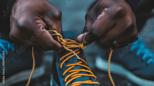 Tying a Shoelace: Close-up of hands tying the laces of a sneaker, with a detailed view of the shoe and laces.