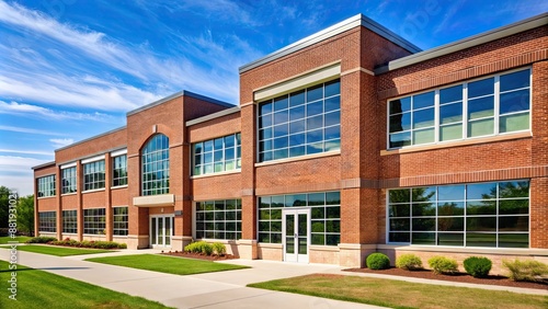 Typical American school building exterior with brick facade and large windows, school, building, exterior