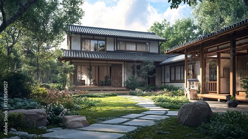 Typical suburban Japanese house, two stories with tiled roof and neutral tones, compact yard with a stone path, sunny day, sharp and balanced view.