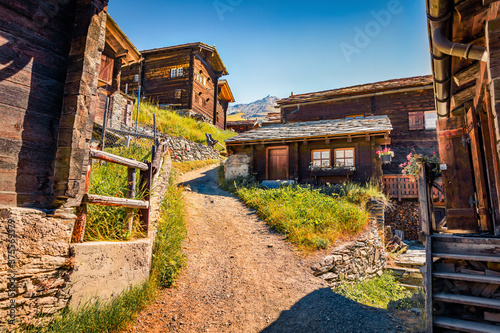Typical wooden houses in Zermatt village. Bright sunny scene of Swiss Alps, Valais canton, Switzerland, Europe. Traveling concept background..