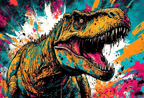 Tyrannosaurus rex dinosaur head on colorful grunge background