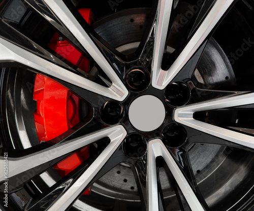 Tyre and alloy wheel. Modern brakes. Car exterior details. Car alloy wheel. New alloy wheel for a car. Alloy rim wheel disc.